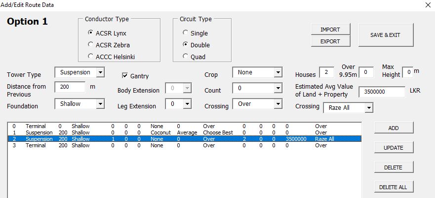 I used ExcelVBA to develop a program where the transmission line path alternatives could be input with the determined variables and the proposed design. Using this design data, and other fixed and variable data such as monetary values the program then estimates the cost of all the alternatives, which would enable the user to select the most optimum route.